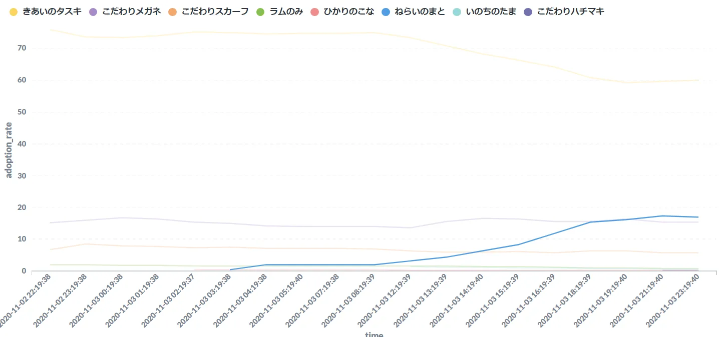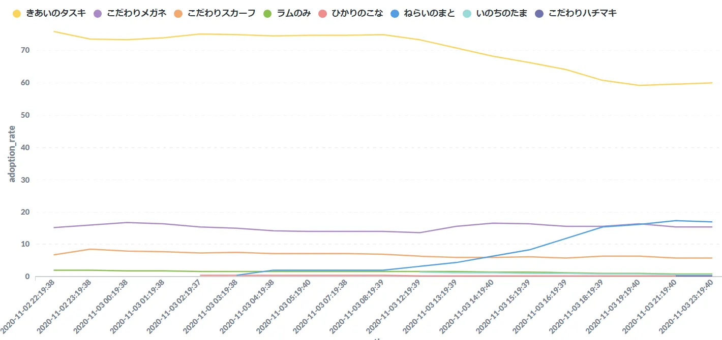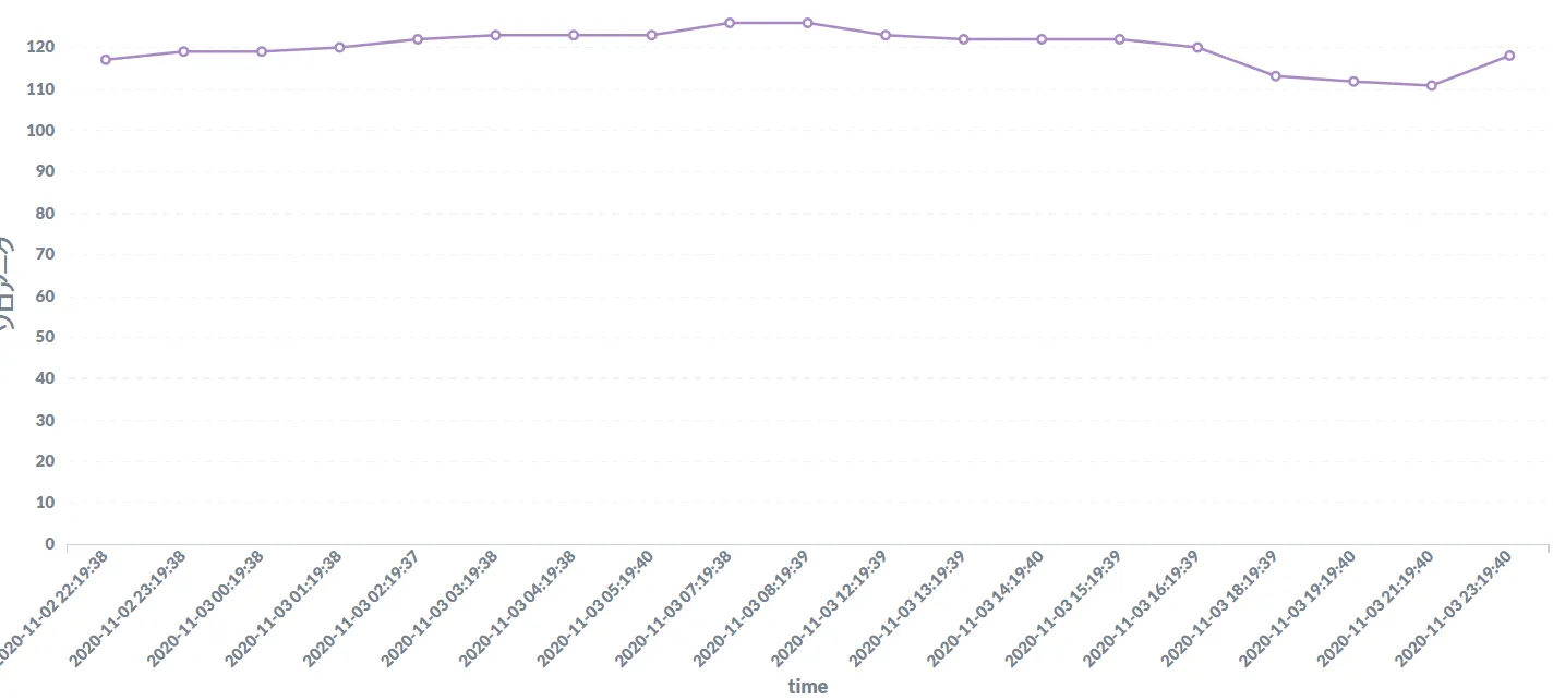 ランクマ実況の配信開始が2020/11/02 22:00なので、配信開始から2020-11-03 23時台までのデータで変化を確認してみます。