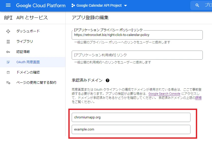 これによりサービスプロバイダ側の承認画面からChrome拡張のオプション画面に戻ってこれるのですが、プロバイダがGoogleの場合、本番用のアプリではGoogle Cloud Platformのダッシュボードからリダイレクト先のURLを登録する必要があります。
